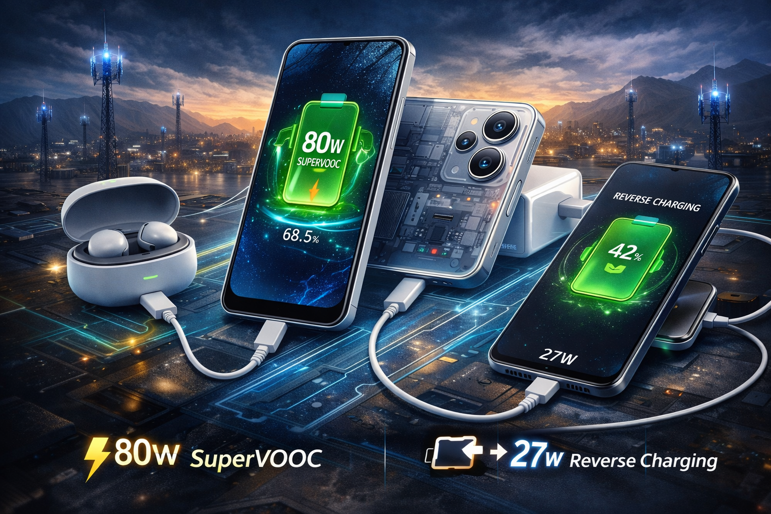 Realme P4 Power 5G demonstrating 80W SuperVOOC fast charging and 27W reverse charging while powering wireless earbuds and another smartphone
