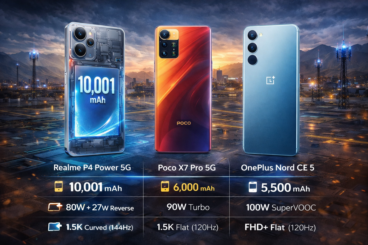 Feature Realme P4 Power 5G Poco X7 Pro 5G OnePlus Nord CE 5